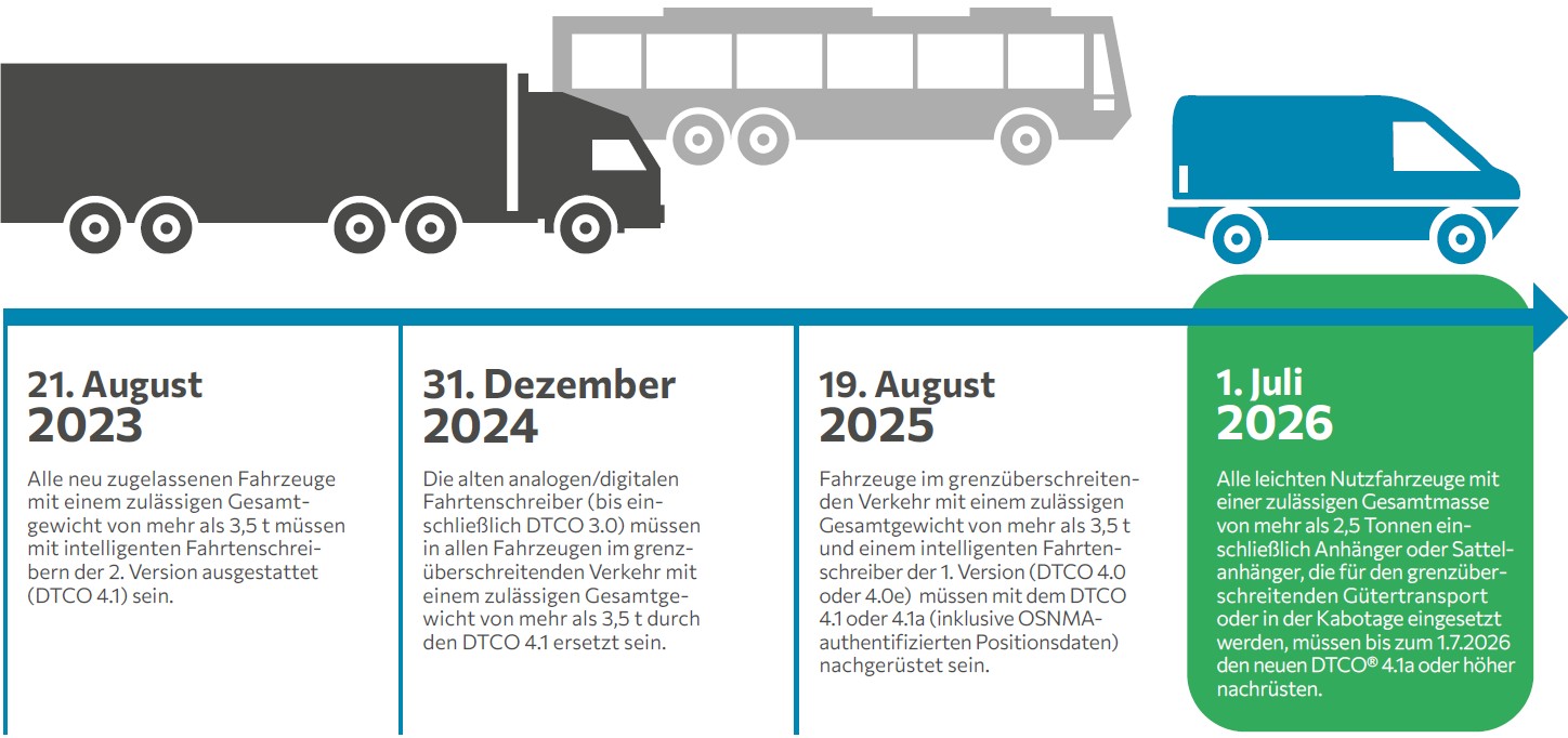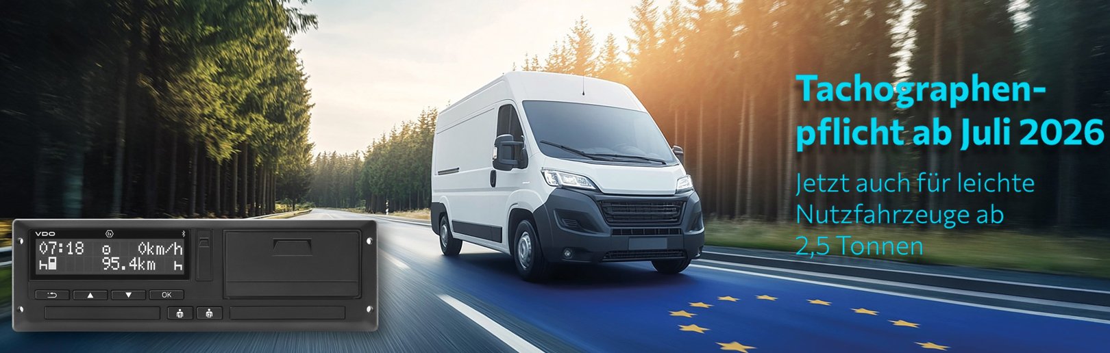 Auch Kleintransporter, Vans und Fahrzeugkombinationen (z. B. Fahrzeuge mit Anhänger) ab 2,5 Tonnen im internationalen Güterverkehr müssen künftig mit einem Tachographen ausgestattet sein.